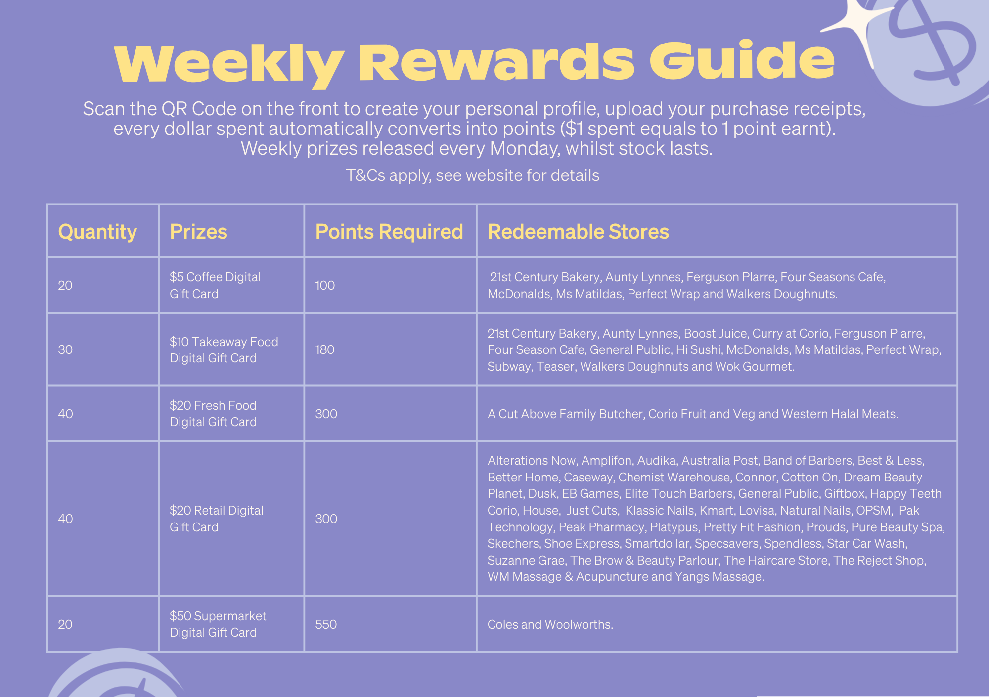Choose from a fantastic selection of prizes, including delicious coffees, convenient gift cards, delightful lunches, and much more, all redeemable right here in the centre.